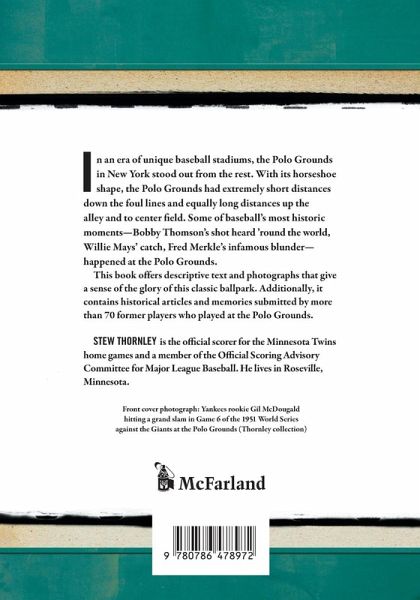 In an era of unique baseball stadiums, the Polo Grounds in New York stood out from the rest. With its horseshoe shape, the Polo Grounds had extremely short distances down the foul lines and equally long distances up the alley and to center field. Some of baseball's most historic moments--Bobby Thomson's Shot Heard Round the World, Willie Mays' Catch, Fred Merkle's infamous blunder--happened at the Polo Grounds. This book offers descriptive text and photographs that give a sense of the glory of this classic ballpark. Additionally, it contains historical articles and memories submitted by more than 70 former players who played at the Polo Grounds.
