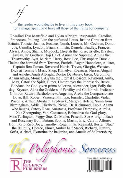 If the reader would decide to live in this crazy book for a magic spell, he'd have all those of the living for company: Rosalind Tess Mansfield and Dylan Albright, inseparable; Caroline, Francesco, Miles the villainous charmer, Justine from Britain, Tootsie, Juanita from Puerto Rico, Eustace, Norah, Lutecia, Mister Cochran, Donut Joe, Camilla, Lyndon, Brian, Shinishi, Daniéle from Marseille, Bradley, Frances, Alyssa, Amos, Shania, Murdock, Cheetah the horse, Estelle, Krysten, Guitar JayJay, Dr. Godfrey, Haji Halef, Asmaa the supreme, Amina the Trustworthy, Ayat, Miriam, Harry, Rose Lee, Christopher, Donald, Canadian Thelma, Patricia, Roger, Hannelore, Allister, Captain Ben Taman, Reverend Harris, Trevor, Giorgio, Webster, salesman Dick, Kamelya, Ebenezer, Monica, nurses Abigail and Amélie, wee Anaïs, Doctor Dewberry, Jason, Geronimo, Ahanu Ahiga, Aiyana the Eternal Blossom, Raymond, Anita, Max, Catori the Spirit, Elmer, Untermeyer, the impresario, Bruce, Bohdana prima ballerina, Alexander, Igor, Polly the dog, Krysten, Akna the Goddess of Fertility and Childbirth, Professor Gilmour, Rawiri, Bartholomew, Angelina, Aroha the Compassionate Love, Bill, Robert, Vanesse, Philippe, Jennifer lifeless temptress, Charlotte, Viola, Priscilla, Arthur, Abraham, Frederick, Margret, Helene, Sarah from Birmingham, Addie, Elizabeth, Richie, Doctor Richmond, Enola, laughing Ahanu, Cutesy Rose, Anastasia, Professor Dempsey, Aurelia, Xue Zhongming, Van, Constance, Bohuslava the God-glory, Miss Turlington, Peggy-Sue, Doctor Mailer, Priscilla Sue Albright, Buck and Rosemary the Brits, Sophia, Martin, Eric, Calvin, Alfonso from San Juan, Joey, Timothy, Roger, Pilar, Reginald, Buster 'Stud' the Hillbilly, Horace, Elmer, Amber half M¿ori, Richard, Dimitri, Sofia, Aleksei, Ekaterina the Ukranian ballerina; and Amelia of Saint Petersburg...