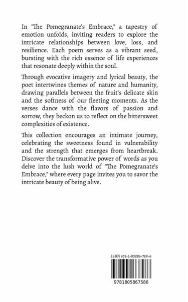 In "The Pomegranate's Embrace," a tapestry of emotion unfolds, inviting readers to explore the intricate relationships between love, loss, and resilience. Each poem serves as a vibrant seed, bursting with the rich essence of life experiences that resonate deeply within the soul. Through evocative imagery and lyrical beauty, the poet intertwines themes of nature and humanity, drawing parallels between the fruit's delicate skin and the softness of our fleeting moments. As the verses dance with the flavors of passion and sorrow, they beckon us to reflect on the bittersweet complexities of existence. This collection encourages an intimate journey, celebrating the sweetness found in vulnerability and the strength that emerges from heartbreak. Discover the transformative power of words as you delve into the lush world of "The Pomegranate's Embrace," where every page invites you to savor the intricate beauty of being alive.