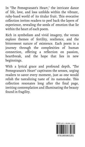 In "The Pomegranate's Heart," the intricate dance of life, love, and loss unfolds within the vibrant, ruby-hued world of its titular fruit. This evocative collection invites readers to peel back the layers of experience, revealing the seeds of emotion that lie within the heart of each poem. Rich in symbolism and vivid imagery, the verses explore themes of fertility, resilience, and the bittersweet nature of existence. Each poem is a journey through the complexities of human connection, offering a reflection on passion, heartbreak, and the hope that lies in new beginnings. With a lyrical grace and profound depth, "The Pomegranate's Heart" captivates the senses, urging readers to savor every moment, just as one would relish the tantalizing taste of its namesake. This collection resonates long after the final page, inviting contemplation and illuminating the beauty found in fragility.