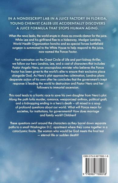 In a nondescript lab in a juice factory in Florida, young chemist Caleb Lee accidentally discovers a juice formula that stops human aging. When the news leaks, the world erupts in chaos as crowds clamor for the juice. While Lee and his girlfriend flee to a hideaway, Medgar Landros, World Health Organization honcho and ex-special forces battlefield surgeon is summoned to the White House to help respond to the juice, now named the Ponce Factor. Part rumination on the Great Circle of Life and part kidnap thriller, we follow our hero Landros, Lee, and a cast of characters that includes Pastor Angela Nero, an unscrupulous minister who believes the Ponce Factor has been given to the world's elite to ensure their exclusive place alongside God. As Nero's plot approaches culmination, Landros plans desperate action of his own after he concludes that the government's inept response is leading the world to destruction and Pastor Nero and her followers to immortal ascension. This road leads to a frantic race to save his own daughter from Nero's plot. Along the path lurks murder, romance, weaponized anthrax, political graft, and a kidnapping ending in a hero's death - all mixed in a soup of profound questions about our world. What will Ponce mean for societies, for institutions, for governments? How does marriage and family work? Children? These questions swirl around the characters as they barrel down separate paths to a small Washington D.C. apartment where they come together in a cataclysmic finale. The woman who would be God meets the final test -- eternal life or sudden death?