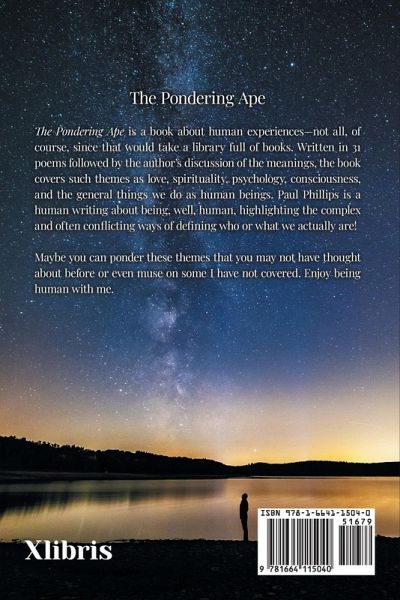 The Pondering Ape is a book about human experiences - not all, of course, since that would take a library full of books. Written in 31 poems followed by the author's discussion of the meanings, the book covers such themes as love, spirituality, psychology, consciousness and the general things we do as human beings. Paul Phillips is a human writing about being, well, human, highlighting the complex and often conflicting ways of defining who or what we actually are! Maybe you can ponder these themes that you may not have thought about before or even muse on some I have not covered. Enjoy being human with me.