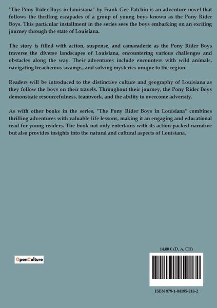 "The Pony Rider Boys in Louisiana" by Frank Gee Patchin is an adventurous tale that follows the Pony Rider Boys-Tad Butler, Ned Rector, Stacy Brown, and Walter Perkins-along with their guide, Bill Lilly, and a cook named Ichabod, as they embark on an expedition into the dense and mysterious canebrakes of Louisiana. The story begins with the boys arriving in Jackson, where they are warmly welcomed by Major Clowney, a distinguished southerner who assists them in preparing for their journey. The boys, known for their horsemanship and adventurous spirit, entertain the Clowney family with a display of their riding skills before setting off into the wilderness. As they venture into the canebrake, the boys encounter the challenging conditions of the swampy terrain, including the presence of snakes and other wildlife. The narrative is filled with humorous incidents, such as Stacy Brown's mishaps, including an accidental explosion caused by cane thrown into the campfire. Despite these challenges, the boys demonstrate their resilience and adaptability, showcasing their ability to handle unexpected situations with courage and humor. The story is rich with descriptions of the natural environment, highlighting the towering cypress trees and dense cane that characterize the Louisiana landscape. The boys' journey is not only a test of their physical endurance but also an opportunity for personal growth and camaraderie. Through their interactions with the local inhabitants and their experiences in the wild, the Pony Rider Boys learn valuable lessons about the importance of teamwork, resourcefulness, and respect for nature.