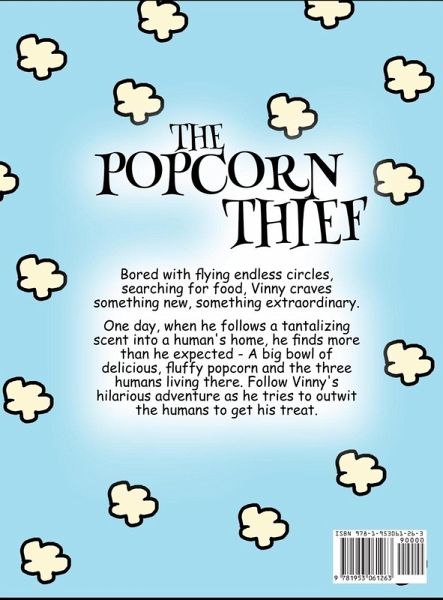 Bored with flying endless circles, searching for food, Vinny craves something new, something extraordinary. One day, when he follows a tantalizing scent into a human's home, he finds more than he expected. A big bowl of delicious, fluffy popcorn...and the three humans living there. Follow Vinny's hilarious adventure as he tries to outwit the humans to get his treat.