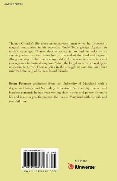 Thomas Crandle's life takes an unexpected turn when he discovers a magical contraption in his eccentric Uncle Ted's garage. Against his uncle's warnings, Thomas decides to try it out and embarks on an amazing adventure that takes him to the end of the road and beyond. Along the way he befriends many odd and remarkable characters and journeys to a fantastical kingdom. When the kingdom is threatened by an unspeakable terror, Thomas joins in the struggle to save the land from ruin with the help of his new found friends.
