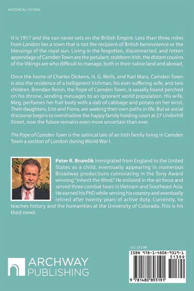 It is 1917 and the sun never sets on the British Empire. Less than three miles from London lies a town that is not the recipient of British benevolence or the blessings of the royal sun. Living in the forgotten, disconnected, and rotten appendage of Camden Town are the petulant, stubborn Irish, the distant cousins of the Vikings are who difficult to manage, both in their native land and abroad. Once the home of Charles Dickens, H. G. Wells, and Karl Marx, Camden Town is also the residence of a belligerent Irishman, his ever-suffering wife, and two children. Brendan Ronin, the Pope of Camden Town, is usually found perched on his throne, sending messages to an ignorant world population. His wife, Meg, perfumes her frail body with a dab of cabbage and potato on her wrist. Their daughters, Erin and Fiona, are seeking their own paths in life. But as social discourse begins to overshadow the happy family holding court at 27 Underhill Street, now the future remains even more uncertain than ever. The Pope of Camden Town is the satirical tale of an Irish family living in Camden Town a section of London during World War I.