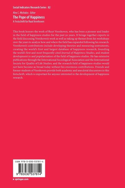 Ruut Veenhoven's Livability Concept and Children's Happiness Around the Globe (Sergiu Baltatescu).- Pursuing Happiness on the Road Less Traveled (Ad Bergsma).- Have the Dutch Become Happier? And What about the Dutch 'Happiness Professor', Ruut Veenhoven? (Jeroen Boelhouwer).- The Forgotten Dimensions of Social Capital: Evidence from Quality of Life Studies (Gael Brulé).- Urban-Rural Happiness Differentials in the Netherlands (Martijn Burger).- Happiness or Life Satisfaction? The Case of Children (Ferran Casas and Mònica González).- Ruut Veenhoven: Worthy Recipient of the Golden Triangle of Happiness (Robert A. Cummins).- Our Fearless Leader (Edward F. Diener).- Your Happiness Comrade-in-Arms (Richard A. Easterlin).- Il Maestro of Happiness (Richard J. Estes).- On the Scientific Study of Happiness (Carol Graham).- The Social Democratic Agenda: The Impact of Scandinavian Social Democratic Regimes on Income Equality, Economic Security, Gender Equality, Levels andInequality of Life Satisfaction (Bruce W. Headey and Ruud Muffels).- Organizations with Virtuous Leaders Flourish More (Martijn Hendriks).- Moving Beyond the GDP: Emerging Measures and Findings (Mohsen Joshanloo).- Zest and Adventures in Happiness Research (Anna Lau).- Ruut Veenhoven: A very Wise Man (Kai Ludwigs).- Unhappiness, Life-Dissatisfaction and Economic Deprivation in the Philippines: Three Decades of Survey History (Mahar Mangahas).- Good Societies, Financial Inequality and Secrecy, and a Good Life: From Aristotle To Piketty (Alex C. Michalos).- Hambakahle, 'Go Well', from Africa (Valerie Møller).- The Good Life Under Attack - Reflections on the Future of the Quality of Life Concept (Heinz-Herbert Noll).- Contentment and Affect in the Assessment of Life Satisfaction: More Empirical Findings and New Questions (Mariano Rojas).- A Happiness Path Taken Together (Peggy Schyns).- What Makes Chinese People Happy? Insights from a Traditional Chinese Essay and a Hong Kong Cantopop (Daniel T.L. Shek).- Calling for Social Support: Whose Support and What Types of Support Matter for Early Adolescents' Life Satisfaction (Kimberly G. Sitter, E. Scott Huebner, and Kimberly J. Hills).- The Relation Between Happiness and Public Policies: The Opinion of University Students (Graciela Tonon).- Prospective Well-Being, Relative Income and Tolerance of Inequality in Japan (Ming-Chang Tsai).- A Passion for Happiness: Ruut Veenhoven, Eudaimonia and the Good Life (Joarvitterso).- Wellbeing and the Four Qualities of Life (Dan Weijers).- Ruut Veenhoven and the Latin-American Paradox of Happiness (Eduardo Wills-Herrera).- A Critique of the Conventional Methods of Survey Item Transformations, with an Eye to Quantification (Bruno D. Zumbo and Pamela Woitschach).- Photographs to Remember (Alex C. Michalos).