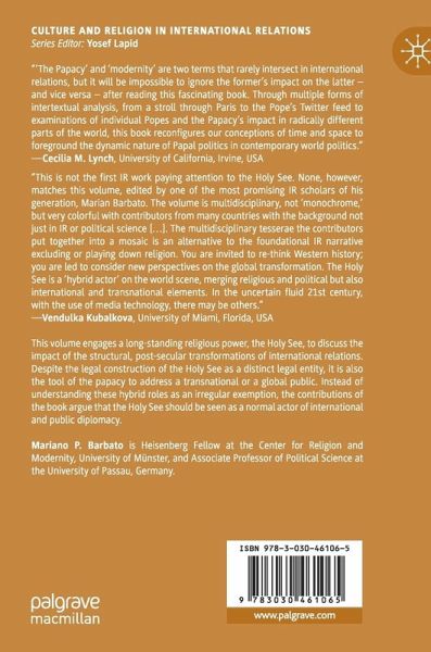Chapter 1. The Holy See, Public Spheres and Postsecular Transformations of International Relations: An Introduction.- Part 1. Media Formats.- Chapter 2. Papal Diplomacy and the Rise of @pontifex.- Chapter 3. The "Media Pope" as a Challenger of Socialism: Pope John Paul II's First Trip to Poland.- Chapter 4. "I put no stock in consensus": The Young Pope and the Progressive/Conservative Cleavage in Filmic Narrations of Papal Power.- Part 2. Geopolitical Stages.- Chapter 5. The Holy See's Vision of an Abrahamic Middle East: Islam, Israel, and Oriental Churches.- Chapter 6. Papal Presence in East and South Asia: China, India and Beyond.- Chapter 7. Thought and Pilgrimage: Polish Heritage of St. John Paul II.- Chapter 8. Spectacle and Power: Sites and Spaces of Papal Visits in Spain.- Part 3. Global Transformation.- Chapter 9. Transatlantic Solidarities: Ultramontanism and Papal Mobilization in Latin America.- Chapter 10. Holy Alliance? The Establishment of Diplomatic Relationsbetween the USA and the Holy See.- Chapter 11. The Holy See as Hybrid Actor: Religion in International, Transnational, and World Society