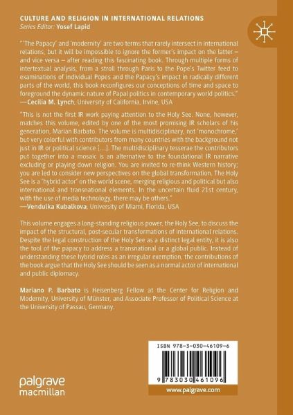 Chapter 1. The Holy See, Public Spheres and Postsecular Transformations of International Relations: An Introduction.- Part 1. Media Formats.- Chapter 2. Papal Diplomacy and the Rise of @pontifex.- Chapter 3. The "Media Pope" as a Challenger of Socialism: Pope John Paul II's First Trip to Poland.- Chapter 4. "I put no stock in consensus": The Young Pope and the Progressive/Conservative Cleavage in Filmic Narrations of Papal Power.- Part 2. Geopolitical Stages.- Chapter 5. The Holy See's Vision of an Abrahamic Middle East: Islam, Israel, and Oriental Churches.- Chapter 6. Papal Presence in East and South Asia: China, India and Beyond.- Chapter 7. Thought and Pilgrimage: Polish Heritage of St. John Paul II.- Chapter 8. Spectacle and Power: Sites and Spaces of Papal Visits in Spain.- Part 3. Global Transformation.- Chapter 9. Transatlantic Solidarities: Ultramontanism and Papal Mobilization in Latin America.- Chapter 10. Holy Alliance? The Establishment of Diplomatic Relationsbetween the USA and the Holy See.- Chapter 11. The Holy See as Hybrid Actor: Religion in International, Transnational, and World Society