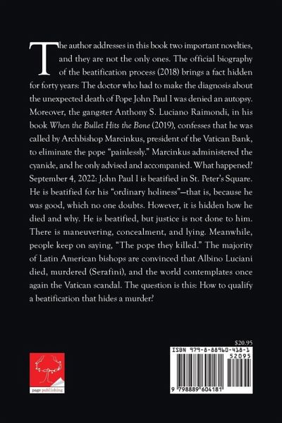 The author addresses in this book two important novelties, and they are not the only ones. The official biography of the beatification process (2018) brings a fact hidden for forty years: The doctor who had to make the diagnosis about the unexpected death of Pope John Paul I was denied an autopsy. Moreover, the gangster Anthony S. Luciano Raimondi, in his book When the Bullet Hits the Bone (2019), confesses that he was called by Archbishop Marcinkus, president of the Vatican Bank, to eliminate the pope "painlessly." Marcinkus administered the cyanide, and he only advised and accompanied. What happened? September 4, 2022: John Paul I is beatified in St. Peter's Square. He is beatified for his "ordinary holiness"--that is, because he was good, which no one doubts. However, it is hidden how he died and why. He is beatified, but justice is not done to him. There is maneuvering, concealment, and lying. Meanwhile, people keep on saying, "The pope they killed." The majority of Latin American bishops are convinced that Albino Luciani died, murdered (Serafini), and the world contemplates once again the Vatican scandal. The question is this: How to qualify a beatification that hides a murder?