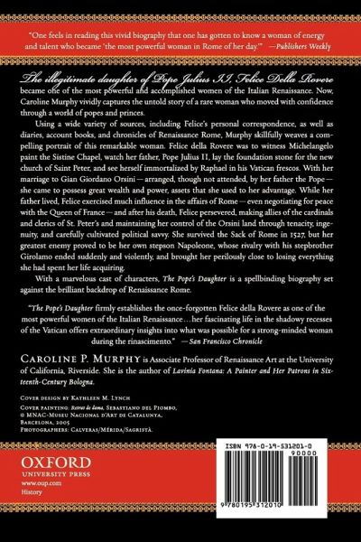 The illegitimate daughter of Pope Julius II, Felice della Rovere became one of the most powerful and accomplished women of the Italian Renaissance. Now, Caroline Murphy vividly captures the untold story of a rare woman who moved with confidence through a world of popes and princes. Using a wide variety of sources, including Felice's personal correspondence, as well as diaries, account books, and chronicles of Renaissance Rome, Murphy skillfully weaves a compelling portrait of this remarkable woman. Felice della Rovere was to witness Michelangelo paint the Sistine Chapel, watch her father Pope Julius II lay the foundation stone for the new Saint Peter's, and saw herself immortalized by Raphael in his Vatican frescos. With her marriage to Gian Giordano Orsini--arranged, though not attended, by her father the Pope--she came to possess great wealth and power, assets which she used to her advantage. While her father lived, Felice exercised much influence in the affairs of Rome, even egotiating for peace with the Queen of France. After his death, Felice persevered, making allies of the cardinals and clerics of St. Peter's and maintaining her control of the Orsini land through tenacity, ingenuity, and carefully cultivated political savvy. She survived the Sack of Rome in 1527, but her greatest enemy proved to be her own stepson Napoleone, whose rivalry with his stepbrother Girolamo ended suddenly and violently, and brought her perilously close to losing everything she had spent her life acquiring. With a marvelous cast of characters, The Pope's Daughter is a spellbinding biography set against the brilliant backdrop of Renaissance Rome.