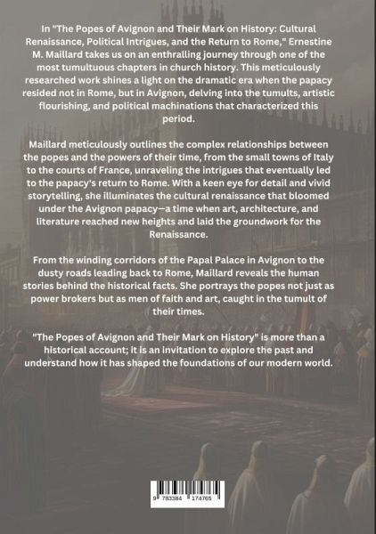 In "The Popes of Avignon and Their Mark on History: Cultural Renaissance, Political Intrigues, and the Return to Rome," Ernestine M. Maillard takes us on an enthralling journey through one of the most tumultuous chapters in church history. This meticulously researched work shines a light on the dramatic era when the papacy resided not in Rome, but in Avignon, delving into the tumults, artistic flourishing, and political machinations that characterized this period.Maillard meticulously outlines the complex relationships between the popes and the powers of their time, from the small towns of Italy to the courts of France, unraveling the intrigues that eventually led to the papacy's return to Rome. With a keen eye for detail and vivid storytelling, she illuminates the cultural renaissance that bloomed under the Avignon papacy-a time when art, architecture, and literature reached new heights and laid the groundwork for the Renaissance.From the winding corridors of the Papal Palace inAvignon to the dusty roads leading back to Rome, Maillard reveals the human stories behind the historical facts. She portrays the popes not just as power brokers but as men of faith and art, caught in the tumult of their times."The Popes of Avignon and Their Mark on History" is more than a historical account; it is an invitation to explore the past and understand how it has shaped the foundations of our modern world.