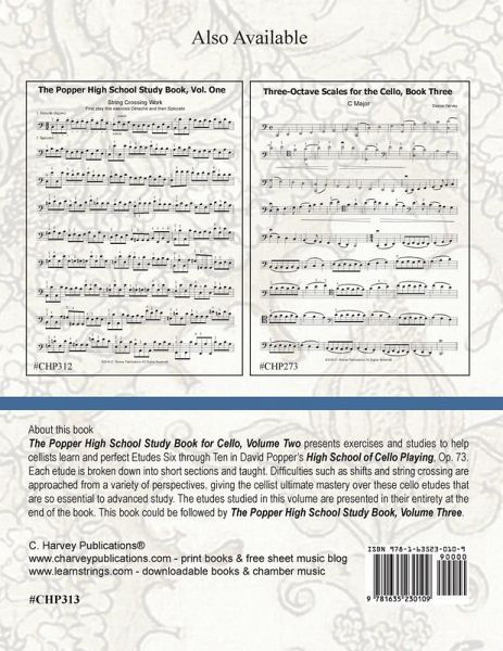 The Popper High School Study Book for Cello, Volume Two presents exercises and studies to help cellists learn and perfect Etudes Six through Ten in David Popper's High School of Cello Playing, Op. 73. Each etude is broken down into short sections and taught. Difficulties such as shifts and string crossing are approached from a variety of perspectives, giving the cellist ultimate mastery over these cello etudes that are so essential to advanced study. The etudes studied in this volume are presented in their entirety at the end of the book. This book could be followed by The Popper High School Study Book, Volume Three.