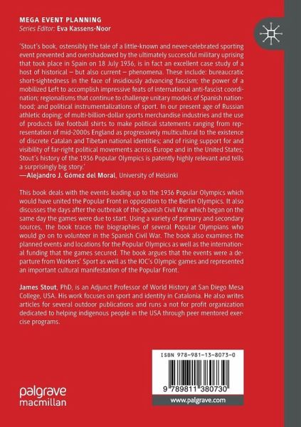 This book deals with the events leading up to the 1936 Popular Olympics which would have united the Popular Front in opposition to the Berlin Olympics. It also discusses the days after the outbreak of the Spanish Civil War which began on the same day the games were due to start. Using a variety of primary and secondary sources, the book traces the biographies of several Popular Olympians who would go on to volunteer in the Spanish Civil War. The book also examines the planned events and locations for the Popular Olympics as well as the international funding that the games secured. The book argues that the events were a departure from Workers' Sport as well as the IOC's Olympic games and represented an important cultural manifestation of the Popular Front.