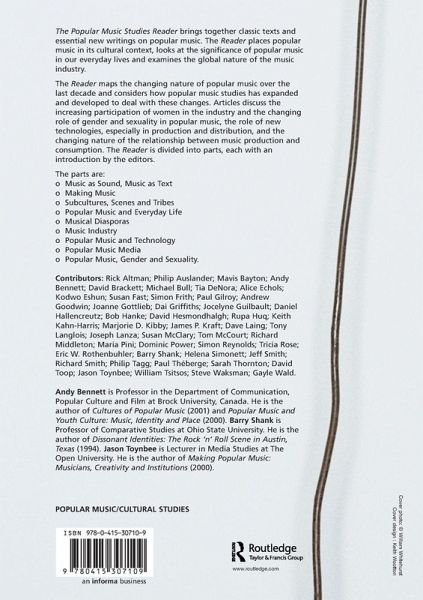 The Popular Music Studies Reader maps the changing nature of popular music over the last decade and considers how popular music studies has expanded and developed to deal with these changes.