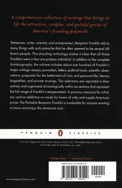 It takes a very inclusive anthology to encompass the protean personality and range of interests of Benjamin Franklin, but The Portable Benjamin Franklin succeeds as no collection has. In addition to the complete Autobiography, the volume contains about 100 of Franklin's major writings-essays, journalism, letters, political tracts, scientific observations, proposals for the improvement of civic and personal life, literary bagatelles, and private musings. The selections are reprinted in their entirety and organized chronologically within six sections that represent the full range of Franklin's temperament. The result is a zestful read for Franklin scholars and anyone wanting to know and enjoy this American icon. For more than seventy years, Penguin has been the leading publisher of classic literature in the English-speaking world. With more than 1,700 titles, Penguin Classics represents a global bookshelf of the best works throughout history and across genres and disciplines. Readers trust the series to provide authoritative texts enhanced by introductions and notes by distinguished scholars and contemporary authors, as well as up-to-date translations by award-winning translators.