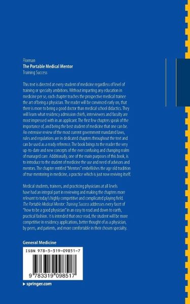 Medical students, trainees, and practicing physicians at all levels have had an integral part in reviewing and making the chapters more relevant to today's highly competitive and complicated playing field. The Portable Medical Mentor: Training Success addresses every facet of "how to be a good physician" in an easy to read and down to earth, practical fashion. It is intended that once read, the student will be more competitive in residency applications, better thought of as a physician, by peers, and patients, and more comfortable in their chosen specialty.