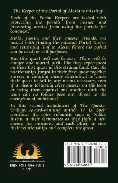 The Keeper of the Portal of Alesia is missing! Each of the Portal Keepers are tasked with protecting the portals from misuse and preventing armies from using the portals for conquest. Nikki, Justin, and their quester friends, are tasked with finding the missing Portal Keeper and returning him to Alesia before his portal can be used for evil purposes. But this quest will not be easy. There will be danger and mortal peril, like they experienced on their last quest in this strange land. Can the relationships forged in their first quest together survive a cunning enemy determined to cause their quest to fail by any means necessary, even if it means torturing every quester on the team or using them against one another until the team can no longer pose any threat to the enemy's mad ambitions? In this second installment of The Quester Trilogy, Award-winning author W. B. Speir continues the spicy romantic saga of Nikki, Justin, a their teammates as they fight a new enemy, his minions, and each other, to save their relationships and complete the quest.