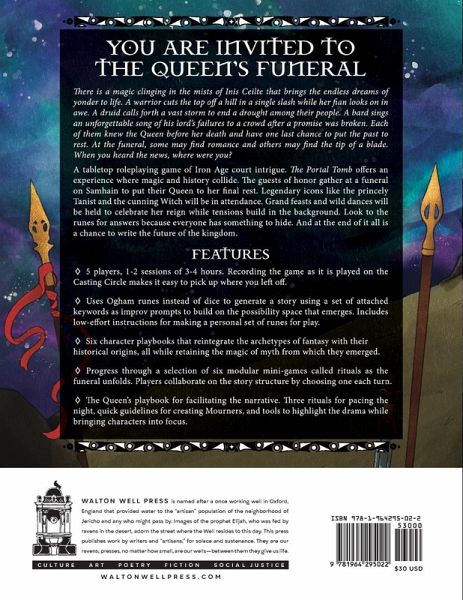 The Portal Tomb is a single session diceless roleplaying that uses an Ogham casting inspired resolution. You are invited to the Queen's funeral-There is a magic clinging in the mists of Inis Ceilte that brings the endless dreams of yonder to life. A warrior cuts the top off a hill in a single slash while her fian looks on in awe. A druid calls forth a vast storm to end a drought among their people. A bard sings an unforgettable song of his lord's failures to a crowd after a promise was broken. Each of them knew the Queen before her death and have one last chance to put the past to rest. At the funeral, some may find romance and others may find the tip of a blade. When you heard the news, where were you? A tabletop roleplaying game of Iron Age court intrigue. The Portal Tomb offers an experience where magic and history collide. The guests of honor gather at a funeral on Samhain to put their Queen to her final rest. Legendary icons like the princely Tanist and the cunning Witch will be in attendance. Grand feasts and wild dances will be held to celebrate her reign while tensions build in the background. Look to the runes for answers because everyone has something to hide. And at the end of it all is a chance to write the future of the kingdom. Features ¿5 players, 1-2 sessions of 3-4 hours. Recording the game as it is played on the Casting Circle makes it easy to pick up where you left off. ¿Uses Ogham runes instead of dice to generate a story using a set of attached keywords as improv prompts to build on the possibility space that emerges. Includes low-effort instructions for making a personal set of runes for play. ¿Six character playbooks that reintegrate the archetypes of fantasy with their historical origins, all while retaining the magic of myth from which they emerged. ¿Progress through a selection of six modular mini-games called rituals as the funeral unfolds. Players collaborate on the story structure by choosing one each turn. ¿The Queen's playbook for facilitating the narrative. Three rituals for pacing the night, quick guidelines for creating Mourners, and tools to highlight the drama while bringing characters into focus.