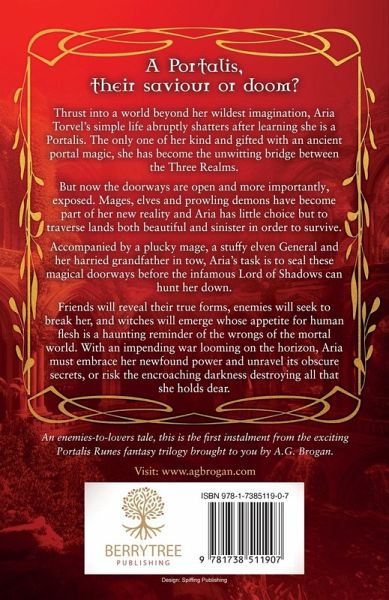 A Portalis, their saviour or doom? Thrust into a world beyond her wildest imagination, Aria Torvel's simple life abruptly shatters after learning she is a Portalis. The only one of her kind and gifted with an ancient portal magic, she has become the unwitting bridge between the Three Realms. But now the doorways are open and more importantly, exposed. Mages, elves and prowling demons have become part of her new reality and Aria has little choice but to traverse lands both beautiful and sinister in order to survive. Accompanied by a plucky mage, a stuffy elven General and her harried grandfather in tow, Aria's task is to seal these magical doorways before the infamous Lord of Shadows can hunt her down. Friends will reveal their true forms, enemies will seek to break her, and witches will emerge whose appetite for human flesh is a haunting reminder of the wrongs of the mortal world. With an impending war looming on the horizon, Aria must seek to embrace her newfound power and unravel its obscure secrets, or risk the encroaching darkness destroying all that she holds dear. An enemies-to-lovers tale, this is the first instalment from the exciting Portalis Runes fantasy trilogy brought to you by A.G. Brogan.