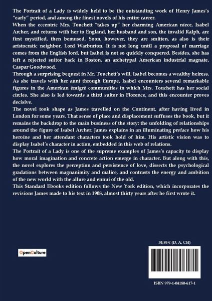 The Portrait of a Lady is widely held to be the outstanding work of Henry James¿s ¿early¿ period, and among the finest novels of his entire career. When the eccentric Mrs. Touchett ¿takes up¿ her charming American niece, Isabel Archer, and returns with her to England, her husband and son, the invalid Ralph, are first mystified, then bemused. Soon, however, they are smitten, as also is their aristocratic neighbor, Lord Warburton. It is not long until a proposal of marriage comes from the English lord, but Isabel is not so quickly conquered. Besides, she has left a rejected suitor back in Boston, an archetypal American industrial magnate, Caspar Goodwood. Through a surprising bequest in Mr. Touchett¿s will, Isabel becomes a wealthy heiress. As she travels with her aunt through Europe, Isabel encounters several remarkable figures in the American émigré communities in which Mrs. Touchett has her social circles. She also is led towards a third suitor in Florence, and this encounter proves decisive. The novel took shape as James travelled on the Continent, after having lived in London for some years. That sense of place and displacement suffuses the book, but it remains the backdrop to the main business of the story: the unfolding of relationships around the figure of Isabel Archer. James explains in an illuminating preface how his heroine and her attendant characters took hold of him. His artistic vision was to display Isabel¿s character in action, embedded in this web of relations. The Portrait of a Lady is one of the supreme examples of James¿s capacity to display how moral imagination and concrete action emerge in character. But along with this, the novel explores the perception and persistence of love, dissects the psychological gradations between magnanimity and malice, and contrasts the energy and ambition of the new world with the allure and ennui of the old. This Standard Ebooks edition follows the New York edition, which incorporates the revisions James made to his text in 1908, almost thirty years after he first wrote it.