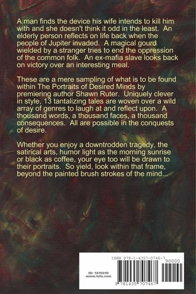 A man finds the device his wife intends to kill him with and she doesn't think it odd in the least. An elderly person reflects on life back when the people of Jupiter invaded. A magical gourd wielded by a stranger tries to end the oppression of the common folk. An ex-mafia slave looks back on victory over an interesting meal. These are a mere sampling of what is to be found within The Portraits of Desired Minds by premiering author Shawn Ruter. Uniquely clever in style, 13 tantalizing tales are woven over a wild array of genres to laugh at and reflect upon. A thousands words, a thousand faces, a thousand consequences. All are possible in the conquests of desire. Whether you enjoy a downtrodden tragedy, the satirical arts, humor light as the morning sunrise or black as coffee, your eye too will be drawn to their portraits. So yield, look within that frame, beyond the painted brush strokes of the mind.