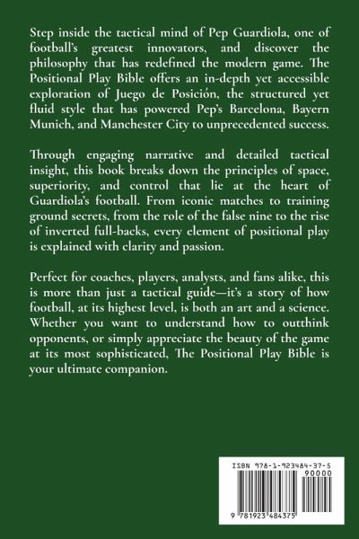 Step inside the tactical mind of Pep Guardiola, one of football's greatest innovators, and discover the philosophy that has redefined the modern game. The Positional Play Bible offers an in-depth yet accessible exploration of Juego de Posición, the structured yet fluid style that has powered Pep's Barcelona, Bayern Munich, and Manchester City to unprecedented success. Through engaging narrative and detailed tactical insight, this book breaks down the principles of space, superiority, and control that lie at the heart of Guardiola's football. From iconic matches to training ground secrets, from the role of the false nine to the rise of inverted full-backs, every element of positional play is explained with clarity and passion. Perfect for coaches, players, analysts, and fans alike, this is more than just a tactical guide-it's a story of how football, at its highest level, is both an art and a science. Whether you want to understand how to outthink opponents, or simply appreciate the beauty of the game at its most sophisticated, The Positional Play Bible is your ultimate companion.
