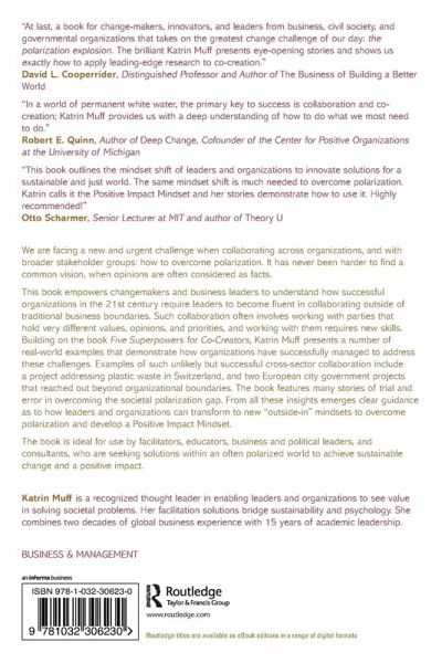 This book empowers changemakers and business leaders to understand how successful organizations in the 21st century require leaders to become fluent in collaborating outside of traditional business boundaries. Such collaboration often involves working with parties that hold very different values, opinions and priorities, and working with them requires new skills. Building on the book Five Superpowers for Co-Creators, Katrin Muff presents a number of real-world examples that demonstrate how organizations have successfully managed to address these challenges. Examples of such unlikely but successful cross-sector collaboration include a project addressing plastic waste in Switzerland, and two European city government projects that reached out beyond organizational boundaries. The book features many stories of trial and error in overcoming the societal polarization gap. From all these insights emerges clear guidance as to how leaders and organizations can transform to new 'outside-in' mindsets to overcome polarization and develop a Positive Impact Mindset.
