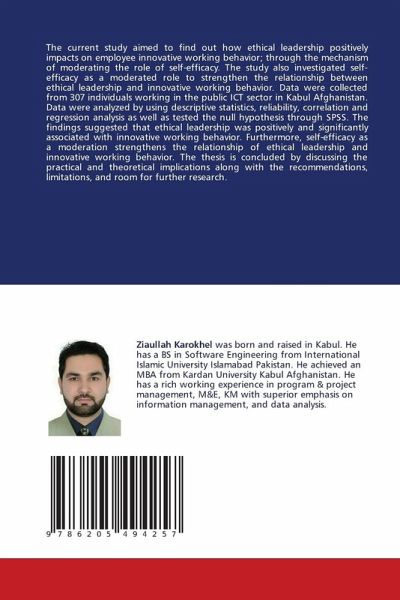 The current study aimed to find out how ethical leadership positively impacts on employee innovative working behavior; through the mechanism of moderating the role of self-efficacy. The study also investigated self-efficacy as a moderated role to strengthen the relationship between ethical leadership and innovative working behavior. Data were collected from 307 individuals working in the public ICT sector in Kabul Afghanistan. Data were analyzed by using descriptive statistics, reliability, correlation and regression analysis as well as tested the null hypothesis through SPSS. The findings suggested that ethical leadership was positively and significantly associated with innovative working behavior. Furthermore, self-efficacy as a moderation strengthens the relationship of ethical leadership and innovative working behavior. The thesis is concluded by discussing the practical and theoretical implications along with the recommendations, limitations, and room for further research.