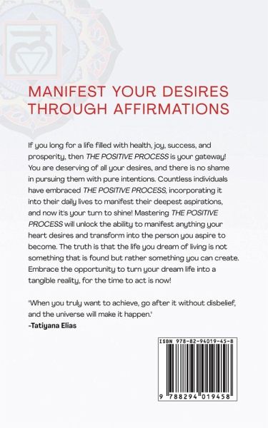 Embark on a Life-Changing Odyssey: Harness the Power of Positivity and Transform Your Mental Landscape Forever. Are you seeking a vibrant transformation, an inner metamorphosis that radiates through every facet of your life? Welcome to a book meticulously crafted for anyone desiring to evolve mentally, emotionally, and spiritually. Regardless of age, background, or experience, this guide promises a transformative journey to a more fulfilled, positive, and empowered self. The Positive Process: Unlock Your Potential One Affirmation at a Time isn't merely a book-it's a revolution. A revolution of thought, of feeling, of being. Centered around the unparalleled strength of daily affirmations and intentional journaling, readers will discover tools to effectively reshape their mental narratives. Each page is infused with strategies, exercises, and insights, ensuring a step-by-step approach to a revitalized mindset. Imagine a life where challenges morph into opportunities, where negative thoughts are promptly replaced by empowering beliefs, and where every day brings forth growth, purpose, and joy. By diligently implementing the practices encapsulated within this book, such a life is not just possible; it's assured. Guided by the transformative experiences of Tatiyana Elias, readers will find solace in her authentic tales of adversity, triumph, and relentless pursuit of positivity. Her journey acts as a beacon, illuminating the path for all those eager to embrace their fullest potential. In today's chaotic world, where mental well-being is paramount yet often elusive, The Positive Process emerges as an essential companion. An emblem of hope, a source of wisdom, and above all, a testament to the boundless capabilities of the human spirit. Embrace the journey, unlock your potential, and witness the magic of genuine self-evolution. Dive in and redefine your reality.