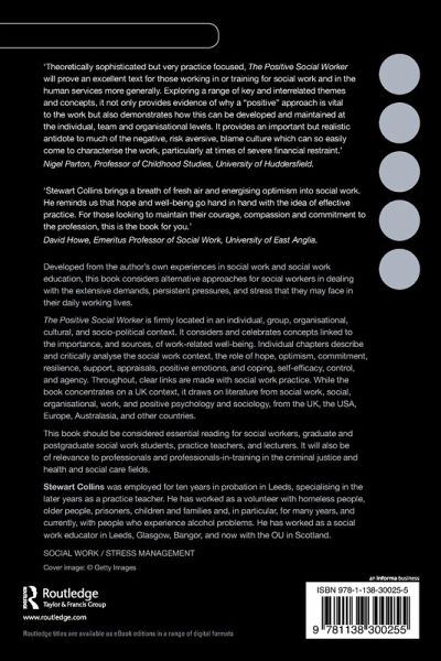 Developed from the author's own experiences in social work and social work education, this book considers alternative approaches for social workers in dealing with the extensive demands, persistent pressures, and stress that they may face in their daily working lives. The Positive Social Worker is firmly located in an individual, group, organisational, cultural, and socio-political context. It considers and celebrates concepts linked to the importance, and sources, of work-related well-being. Individual chapters describe and critically analyse the social work context, the role of hope, optimism, commitment, resilience, support, appraisals, positive emotions, and coping, self-efficacy, control, and agency. Throughout, clear links are made with social work practice. While the book concentrates on a UK context, it draws on literature from social work, social, organisational, work, and positive psychology and sociology, from the UK, the USA, Europe, Australasia, and other countries. This book should be considered essential reading for social workers, graduate and postgraduate social work students, practice teachers, and lecturers. It will also be of relevance to professionals and professionals-in-training in the criminal justice and health and social care fields.