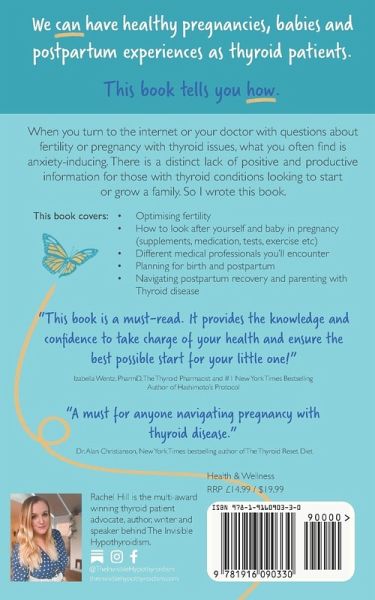 We can have healthy pregnancies, babies and postpartum experiences with hypothyroidism and hashimoto's. This book tells you how. When you turn to the internet or your doctor with questions about fertility or pregnancy with thyroid issues, what you often find is anxiety-provoking. There is a distinct lack of positive and productive information for those with thyroid conditions looking to start or grow their family. So I wrote this book. This book covers: * Optimising fertility with a thyroid condition * How to look after yourself and baby in pregnancy (supplements, thyroid medication, blood tests, thyroid flares, exercising and more) * Different medical professionals you'll encounter * Planning for the birth and postpartum you want * Navigating postpartum recovery and parenting with thyroid disease This thyroid health book aims to save others from the heartbreak Rachel experienced with pregnancy loss in thyroid disease. Understanding your thyroid condition and how it impacts your fertility shouldn't mean diving into complicated medical books. Regain the positive spirit you need to get past hypothyroidism and Hashimoto's and have a positive pregnancy experience. Be part of the thousands who have benefited from Rachel Hill's, honest, authentic and easy-to-follow style of writing. A pregnancy and thyroid awareness book written by multi-award winning thyroid patient advocate Rachel Hill, founder of The Invisible Hypothyroidism