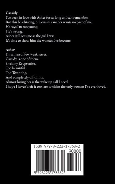 Cassidy I've been in love with Asher for as long as I can remember. But this headstrong, billionaire rancher wants no part of me. He says I'm too young. He's wrong. Asher still sees me as the girl I was. It's time to show him the woman I've become. Asher I'm a man of few weaknesses. Cassidy is one of them. She's my Kryptonite. Too beautiful. Too Tempting. And completely off-limits. Almost losing her is the wake up call I need. I hope I haven't left it too late to claim the only woman I've ever loved.