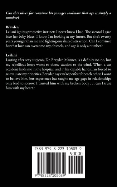 Can this silver fox convince his younger soulmate that age is simply a number? Brayden Leilani ignites protective instincts I never knew I had. The second I gaze into her baby blues, I know I'm looking at my future. But she's twenty years younger than me and fighting our shared attraction. Can I convince her that love can overcome any obstacle, and age is only a number? Leilani Lusting after sexy surgeon, Dr. Brayden Manner, is a definite no-no, but my rebellious heart wants to throw caution to the wind. When a car accident lands me in the hospital, and in his capable hands, I'm forced to re-evaluate my priorities. Brayden says we're perfect for each other. I want to believe him, but experience has taught me age gaps in relationships only lead to sorrow. I trusted him with my broken body . . . can I trust him with my heart?