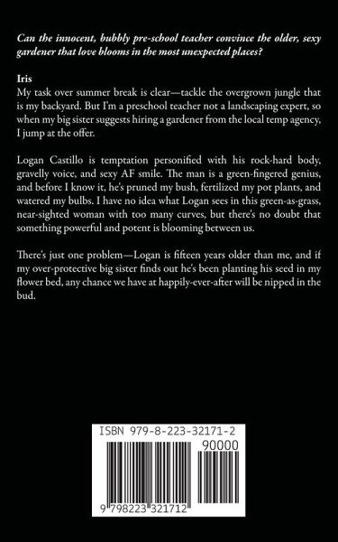 Can the innocent, bubbly pre-school teacher convince the older, sexy gardener that love blooms in the most unexpected places? Iris My task over summer break is clear-tackle the overgrown jungle that is my backyard. But I'm a preschool teacher not a landscaping expert, so when my big sister suggests hiring a gardener from the local temp agency, I jump at the offer. Logan Castillo is temptation personified with his rock-hard body, gravelly voice, and sexy AF smile. The man is a green-fingered genius, and before I know it, he's pruned my bush, fertilized my pot plants, and watered my bulbs. I have no idea what Logan sees in this green-as-grass, near-sighted woman with too many curves, but there's no doubt that something powerful and potent is blooming between us. There's just one problem-Logan is fifteen years older than me, and if my over-protective big sister finds out he's been planting his seed in my flower bed, any chance we have at happily-ever-after will be nipped in the bud.