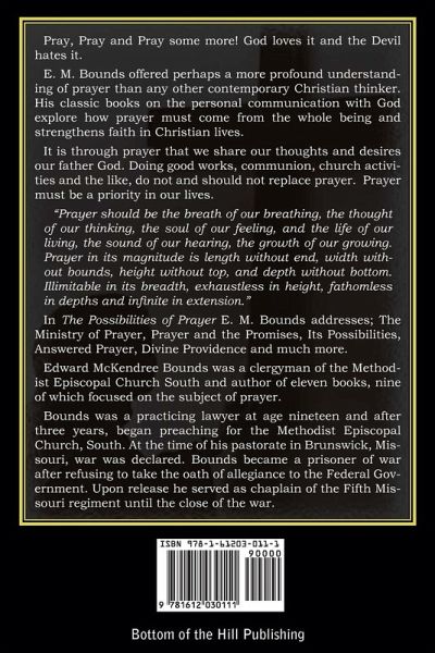 Pray, Pray and Pray some more! God loves it and the Devil hates it. E. M. Bounds offered perhaps a more profound understanding of prayer than any other contemporary Christian thinker. His classic books on the personal communication with God explore how prayer must come from the whole being and strengthens faith in Christian lives. It is through prayer that we share our thoughts and desires our father God. Doing good works, communion, church activities and the like, do not and should not replace prayer. Prayer must be a priority in our lives. "Prayer should be the breath of our breathing, the thought of our thinking, the soul of our feeling, and the life of our living, the sound of our hearing, the growth of our growing. Prayer in its magnitude is length without end, width without bounds, height without top, and depth without bottom. Illimitable in its breadth, exhaustless in height, fathomless in depths and infinite in extension." In The Possibilities of Prayer E. M. Bounds addresses; The Ministry of Prayer, Prayer and the Promises, Its Possibilities, Answered Prayer, Divine Providence and much more. Edward McKendree Bounds was a clergyman of the Methodist Episcopal Church South and author of eleven books, nine of which focused on the subject of prayer. Bounds was a practicing lawyer at age nineteen and after three years, began preaching for the Methodist Episcopal Church, South. At the time of his pastorate in Brunswick, Missouri, war was declared. Bounds became a prisoner of war after refusing to take the oath of allegiance to the Federal Government. Upon release he served as chaplain of the Fifth Missouri regiment until the close of the war.