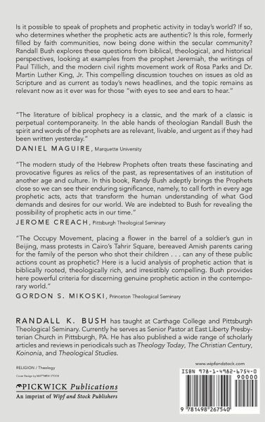 Is it possible to speak of prophets and prophetic activity in today's world? If so, who determines whether the prophetic acts are authentic? Is this role, formerly filled by faith communities, now being done within the secular community? Randall Bush explores these questions from biblical, theological, and historical perspectives, looking at examples from the prophet Jeremiah, the writings of Paul Tillich, and the modern civil rights movement work of Rosa Parks and Dr. Martin Luther King, Jr. This compelling discussion touches on issues as old as scripture and as current as today's news headlines, and the topic remains as relevant now as it ever was for those ""with eyes to see and ears to hear."" ""The literature of biblical prophecy is a classic, and the mark of a classic is perpetual contemporaneity. In the able hands of theologian Randall Bush the spirit and words of the prophets are as relevant, livable, and urgent as if they had been written yesterday."" --Daniel Maguire, Marquette University ""The modern study of the Hebrew Prophets often treats these fascinating and provocative figures as relics of the past, as representatives of an institution of another age and culture. In this book, Randy Bush adeptly brings the Prophets close so we can see their enduring significance, namely, to call forth in every age prophetic acts, acts that transform the human understanding of what God demands and desires for our world. We are indebted to Bush for revealing the possibility of prophetic acts in our time."" --Jerome Creach, Pittsburgh Theological Seminary ""The Occupy Movement, placing a flower in the barrel of a soldier's gun in Beijing, mass protests in Cairo's Tahrir Square, bereaved Amish parents caring for the family of the person who shot their children . . . can any of these public actions count as prophetic? Here is a lucid analysis of prophetic action that is biblically rooted, theologically rich, and irresistibly compelling. Bush provides here powerful criteria for discerning genuine prophetic action in the contemporary world."" --Gordon S. Mikoski, Princeton Theological Seminary Randall Bush has taught at Carthage College and Pittsburgh Theological Seminary. Currently he serves as Senior Pastor at East Liberty Presbyterian Church in Pittsburgh, Pennsylvania. He has also published a wide range of scholarly articles and reviews in periodicals such as Theology Today, The Christian Century, Koinonia, and Theological Studies.