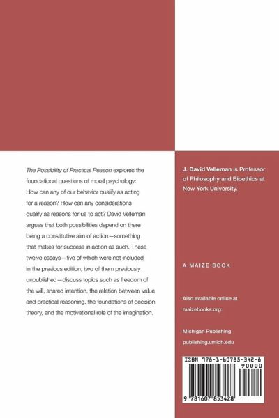 The Possibility of Practical Reason explores the foundational questions of moral psychology: How can any of our behavior qualify as acting for a reason? How can any considerations qualify as reasons for us to act? David Velleman argues that both possibilities depend on there being a constitutive aim of action―something that makes for success in action as such. These twelve essays―five of which were not included in the previous edition, two of them previously unpublished―discuss topics such as freedom of the will, shared intention, the relation between value and practical reasoning, the foundations of decision theory, and the motivational role of the imagination.