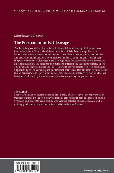 The book begins with a discussion of Lipset-Rokkan's theory of cleavages and its continuations. The author's interpretation of this theory is applied to a historical context: the communist system that divided society into communist and anti-communist sides. They survived the fall of communism, resulting in the post-communist cleavage. This cleavage manifested itself in social identities, electoral behavior, the shape of the party system and the attitudes of party elites. The problem of generalizing Lipset-Rokkan's theory is considered - its scope and applicability to the various post-communist countries. The problem of persistence is also discussed - the post-communist cleavage was sustained by various factors, but also weakened by the actions and choices made by the party elites.