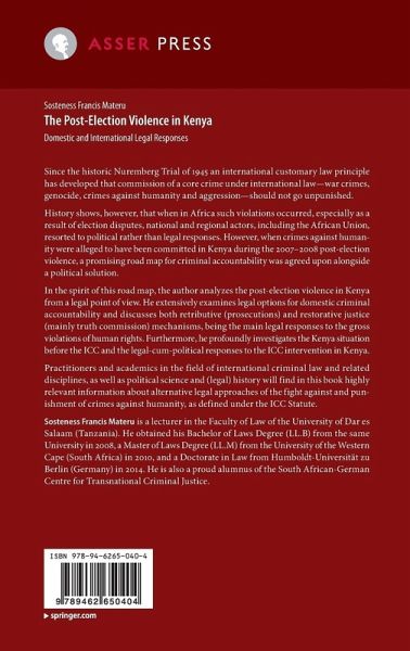 In the spirit of this road map, the author analyzes the post-election violence in Kenya from a legal point of view. He extensively examines legal options for domestic criminal accountability and discusses both retributive (prosecutions) and restorative justice (mainly truth commission) mechanisms, being the main legal responses to the gross violations of human rights. Furthermore, he thoroughly investigates the Kenya situation before the ICC and the legal-cum-political responses to the ICC intervention in Kenya.