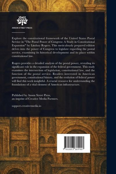 Explore the constitutional framework of the United States Postal Service in "The Postal Power of Congress: A Study in Constitutional Expansion" by Lindsay Rogers. This meticulously prepared edition delves into the power of Congress to legislate regarding the postal service, examining its historical development and its place within constitutional law. Rogers provides a detailed analysis of the postal power, revealing its significant role in the expansion of the federal government. This study examines the intersection of legislation, constitutional law, and the function of the postal service. Readers interested in American government, constitutional history, and the evolution of federal power will find this work insightful. A crucial resource for understanding the foundations of a vital element of American infrastructure. This work has been selected by scholars as being culturally important, and is part of the knowledge base of civilization as we know it. This work is in the public domain in the United States of America, and possibly other nations. Within the United States, you may freely copy and distribute this work, as no entity (individual or corporate) has a copyright on the body of the work. Scholars believe, and we concur, that this work is important enough to be preserved, reproduced, and made generally available to the public. We appreciate your support of the preservation process, and thank you for being an important part of keeping this knowledge alive and relevant.