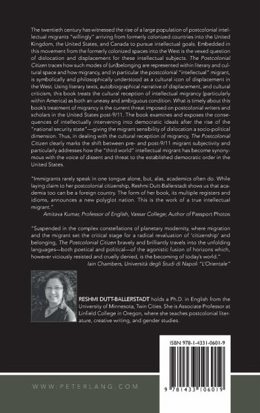 «Immigrants rarely speak in one tongue alone, but, alas, academics often do. While laying claim to her postcolonial citizenship, Reshmi Dutt-Ballerstadt shows us that academia too can be a foreign country. The form of her book, its multiple registers and idioms, announces a new polyglot nation. This is the work of a true intellectual migrant.» (Amitava Kumar, Professor of English, Vassar College; Author of 'Passport Photos')