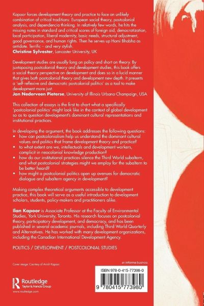 'Kapoor's work does a very useful job in uniting social (and cultural) theory with development ... This is done through an impressive critical interrogation of some of the key issues in the study of development (and indeed, international politics) today, such as governance, human rights and participation. Kapoor convincingly shows how much of the discourse of mainstream development is complicit with a neo-colonialism based on knowledge and power ... But what separates this book from so much of the literature on post-colonial and postdevelopment approaches is the attempt to move the debate forward. Here Kapoor's focus is on the promotion of a radical 'self-reflexivity' which does not silence the subaltern ... [Kapoor] is to be commended ... [This is] a very important contribution to the literature on post-colonial theory and development.'