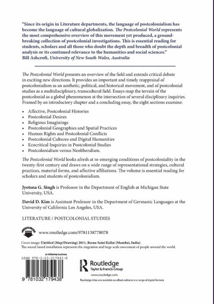 The Postcolonial World presents an overview of the field and extends critical debate in exciting new directions. It provides an important and timely reappraisal of postcolonialism as an aesthetic, political, and historical movement, and of postcolonial studies as a multidisciplinary, transcultural field. Essays map the terrain of the postcolonial as a global phenomenon at the intersection of several disciplinary inquiries. Framed by an introductory chapter and a concluding essay, the eight sections examine: Affective, Postcolonial Histories Postcolonial Desires Religious Imaginings Postcolonial Geographies and Spatial Practices Human Rights and Postcolonial Conflicts Postcolonial Cultures and Digital Humanities Ecocritical Inquiries in Postcolonial Studies Postcolonialism versus Neoliberalism The Postcolonial World looks afresh at re-emerging conditions of postcoloniality in the twenty-first century and draws on a wide range of representational strategies, cultural practices, material forms, and affective affiliations. The volume is an essential reading for scholars and students of postcolonialism.
