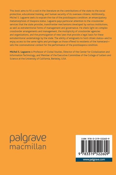 This book aims to fill a void in the literature on the contributions of the state to the social protection, educational training, and human security of its overseas citizens. Additionally, Michel S. Laguerre seeks to explain the rise of the postdiaspora condition: an emancipatory metamorphosis of diaspora status. Laguerre pays particular attention to the crossborder services that the state provides, transfrontier mechanisms developed by various institutions, as well as extraterritorial forms of management and governance. He sheds light on complex crossborder arrangements and management, the multiplicity of crossborder agencies and organizations, and the promulgation of new laws that provide a legal basis for these extraterritorial undertakings by the state. The ability of emigrants to hold citizen status-and to enjoy access to the same rights and privileges as those offered to residents of the homeland-sets the cosmonational context for the performance of the postdiaspora condition.