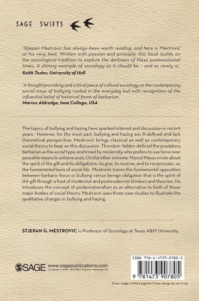 The topics of bullying and hazing have sparked interest and discussion in recent years. Hazing is a crime in the United States, and Western nations have made efforts to stamp out bullying in schools, the workplace, and institutions. However, for the most part, bullying and hazing are ill-defined and lack theoretical perspective. Mestrovic brings classical as well as contemporary social theory to bear on this discussion. Thorstein Veblen defined the predatory barbarian as the social type, enshrined by modernity, who prefers to use force over peacable means to achieve ends. On the other extreme, Marcel Mauss wrote about the spirit of the gift and its obligations - to give, to receive, and to reciprocate - as the fundamental basis of social life. Yet, he argued that the spirit of modernity was disappearing with the progress of modernity. Mestrovic traces this fundamental opposition between barbaric force or bullying versus benign obligation that is the spirit of the gift through a host of modernist and postmodernist thinkers and theories. He introduces the concept of the 'postemotional bully' as an alternative to both of these major bodies of social theory. The postemotional bully, as a social type, is fungible, beset by screen-images on media and social media that are isolating, and is at the mercy of the peer-group.
