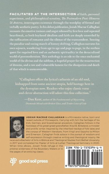 FACILITATED AT THE INTERSECTION of faith, personal experience, and philosophical scrutiny, The Postmodern Poet: Himeros & Anteros, interrogates existence through the wordplay of formal and verbally aesthetic poetry. In his debut publication, Josiah Macrae Callaghan recounts the emotive tremors and angst released by first love and repeated heartbreak, as both boyhood idealism and faith are deeply unsettled by the suffocation of romance and the silence of the transcendent. Sensing the peculiar and vexing march of history shifting, Callaghan narrates his own sojourn, wandering from age to age and page to page, in the restless quest for requited love and an authentic spirituality in the desacralized world of postmodernism. This anthology is an ode to the once enchanted world of the divine and the sublime, a hopeful prayer for the resurrection of dreams, and a raw and vulnerable lament for the dissipation and death of that which is unrecoverable.