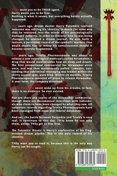 The Potemkin Mosaic is the dream journal of a man who is losing his mind. Black market dream doctor Harry Potemkin edits people's memories for a living, and when he suspects that his own memories are being edited, he starts writing down his dreams. As Harry deconstructs his dreams, he discovers that he-Harry Potemkin-may not be a real person. His entire life might be nothing more than a persona adopted by someone else as a way of coping with mental trauma. As Harry falls farther and farther into the dream world, he discovers both a secret history of dreams and a covert conspiracy run by a pharmaceutical corporation who has been testing mind-altering drugs on unknown patients for decades. The Potemkin Mosaic turns traditional narrative problems on their heads. Harry's investigation into his identity is a surreal, self-devouring tour de force into the associative dreamscapes of contemporary consciousness. Who are we? may be the ultimate question we all face, but Harry takes it one step further and wonders: Who are we when we dream, and is that our true identity?