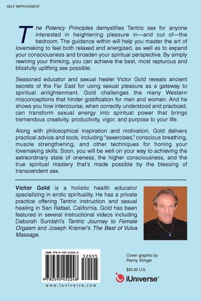 The Potency Principles demystifies Tantric sex for anyone interested in heightening pleasure in-and out of-the bedroom. The guidance within will help you master the art of lovemaking to feel both relaxed and energized, as well as to expand your consciousness and broaden your spiritual perspective. By simply rewiring your thinking, you can achieve the best, most rapturous and blissfully uplifting sex possible. Seasoned educator and sexual healer Victor Gold reveals ancient secrets of the Far East for using sexual pleasure as a gateway to spiritual enlightenment. Gold challenges the many Western misconceptions that hinder gratification for men and women. And he shows you how intercourse, when correctly understood and practiced, can transform sexual energy into spiritual power that brings tremendous creativity, productivity, vigor, and purpose to your life. Along with philosophical inspiration and motivation, Gold delivers practical advice and tools, including "sexercises," conscious breathing, muscle strengthening, and other techniques for honing your lovemaking skills. Soon, you will be well on your way to achieving the extraordinary state of oneness, the higher consciousness, and the true spiritual mastery that's made possible by the blessing of transcendent sex.