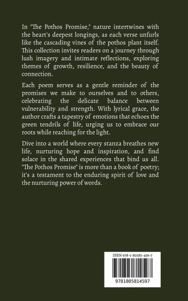 In "The Pothos Promise," nature intertwines with the heart's deepest longings, as each verse unfurls like the cascading vines of the pothos plant itself. This collection invites readers on a journey through lush imagery and intimate reflections, exploring themes of growth, resilience, and the beauty of connection. Each poem serves as a gentle reminder of the promises we make to ourselves and to others, celebrating the delicate balance between vulnerability and strength. With lyrical grace, the author crafts a tapestry of emotions that echoes the green tendrils of life, urging us to embrace our roots while reaching for the light. Dive into a world where every stanza breathes new life, nurturing hope and inspiration, and find solace in the shared experiences that bind us all. "The Pothos Promise" is more than a book of poetry; it's a testament to the enduring spirit of love and the nurturing power of words.
